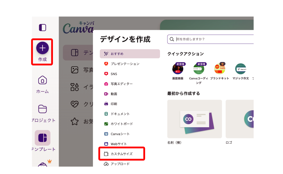 ・ホーム画面左上【作成(+)】をクリックし【カスタムサイズ】を選択