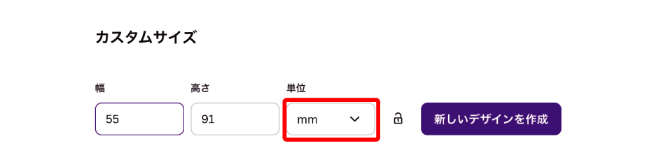 ・単位を【mm】に変更し仕上がりサイズを入力。→【新しいデザインを作成】