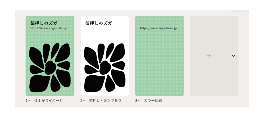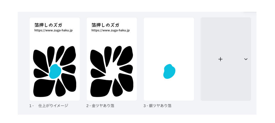 仕上がりイメージ・箔押し・モノクロ/カラー印刷の計3ページ作成します。