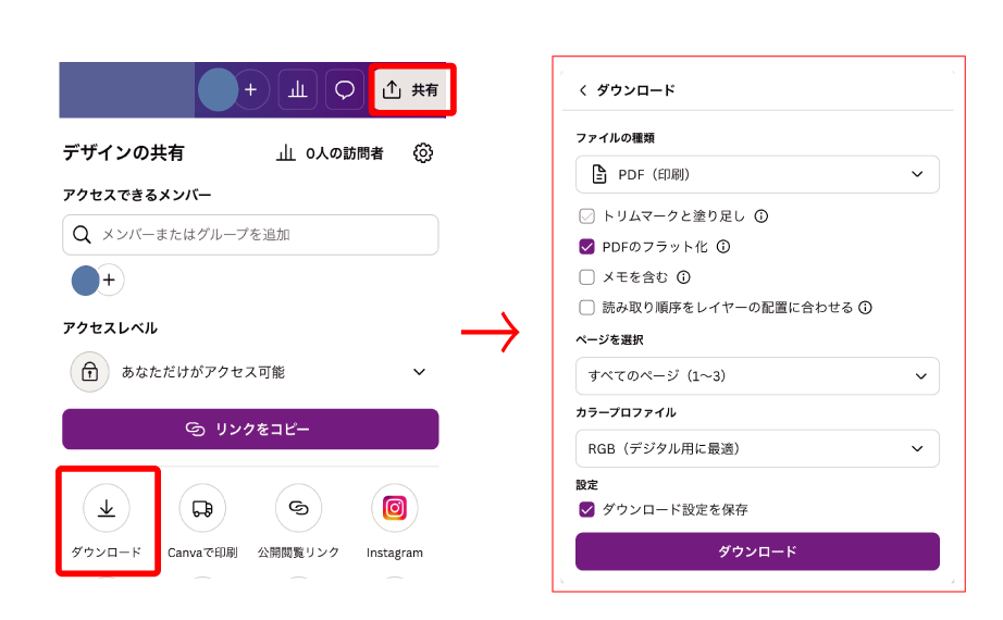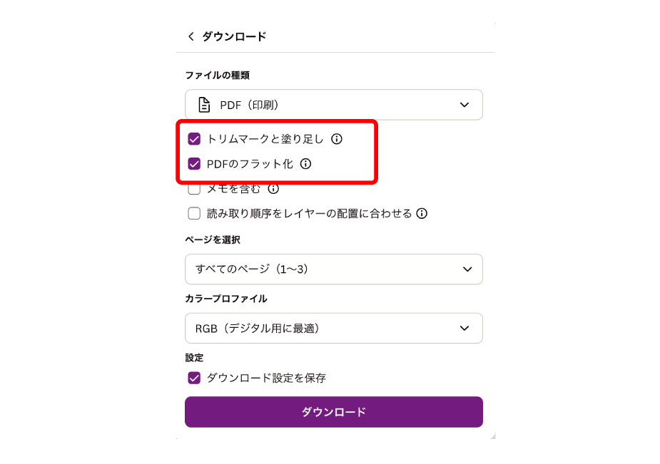 ・カラープロファイル:無料版Canvaをお使いの場合は【RGB】で保存を選択。