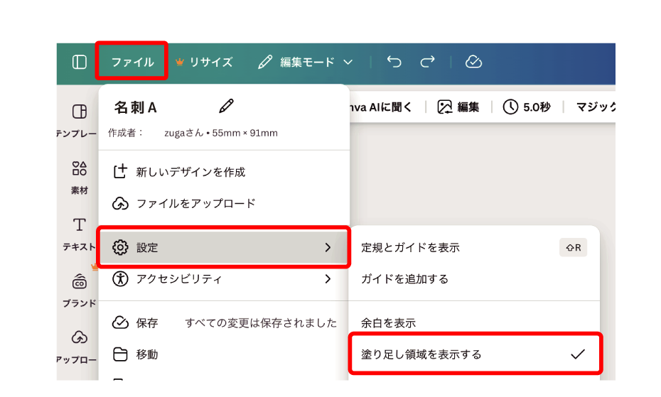 ・作成:【ファイル】をクリックし【設定】からを【塗りたし領域を表示する】を選択。