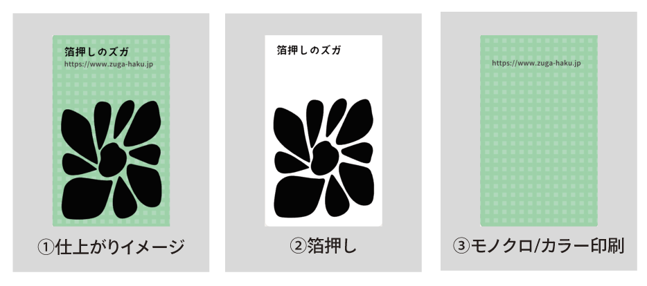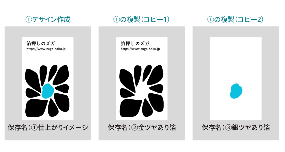 ■①仕上がりイメージ ②箔押し ③モノクロ/カラー印刷 の3つに分けてデータを保存してください。