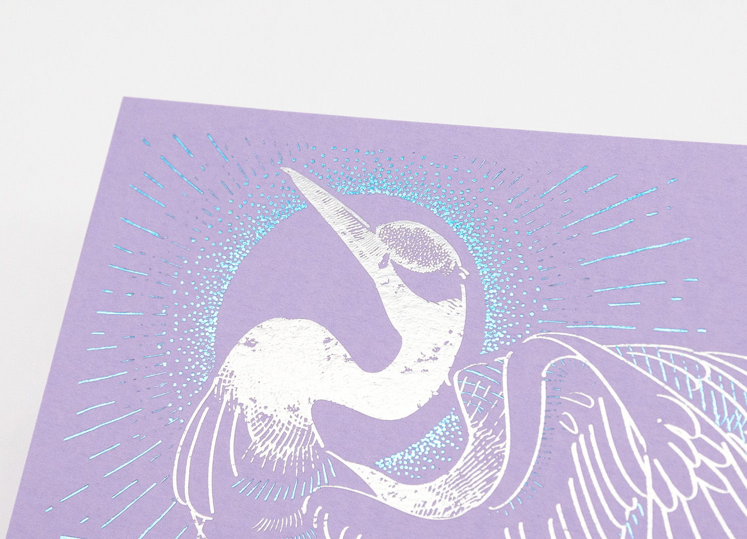 オモテは銀ツヤ消し箔とフレッシュウォーター箔、宛名面は金ツヤ消し箔で箔押ししたラベンダーカラーのカラープラン紙