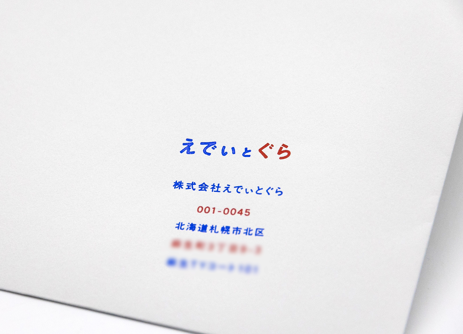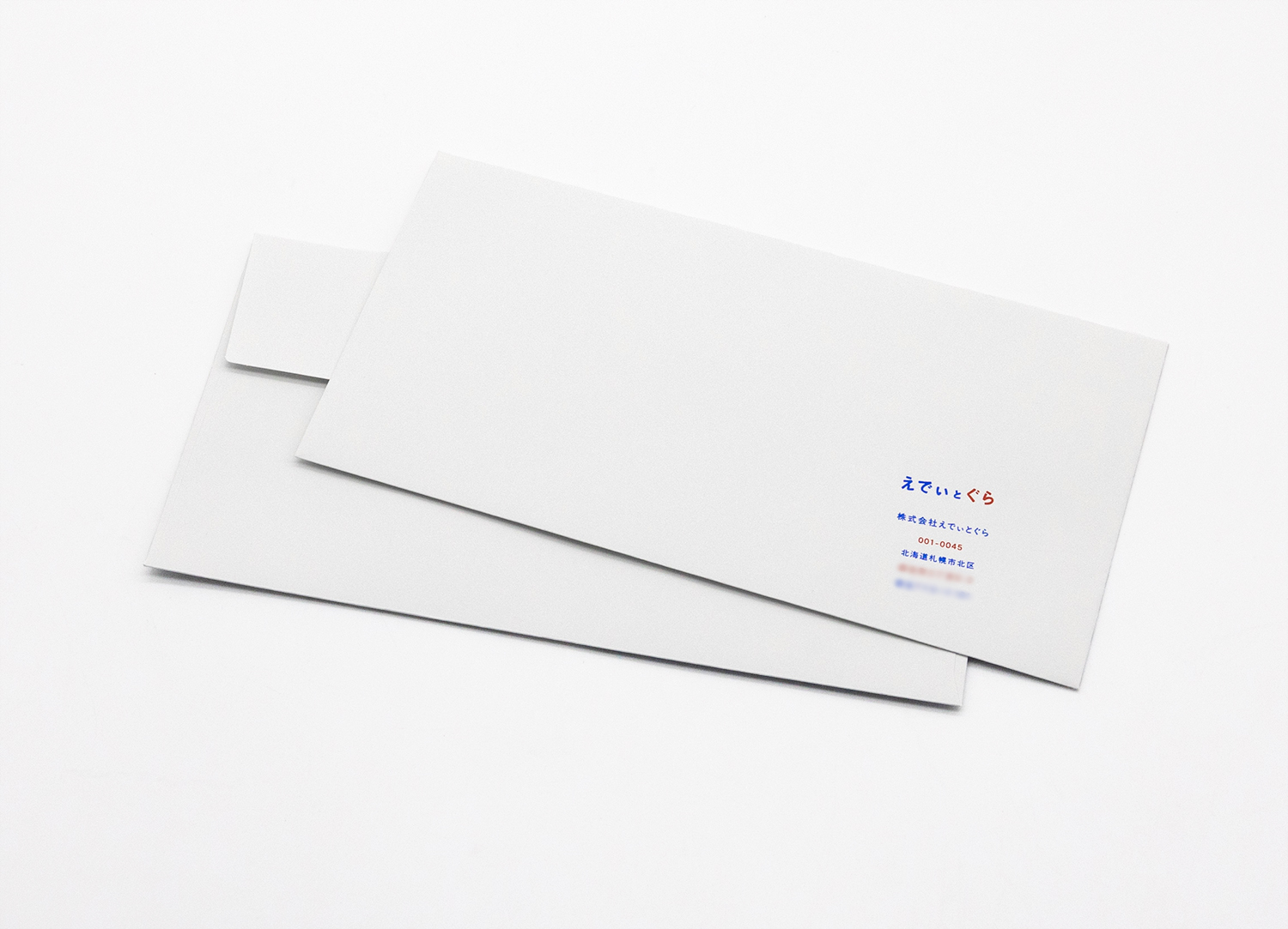 青マット箔と赤マット箔で箔押ししたライトグレーカラーのコットン長3カマス封筒