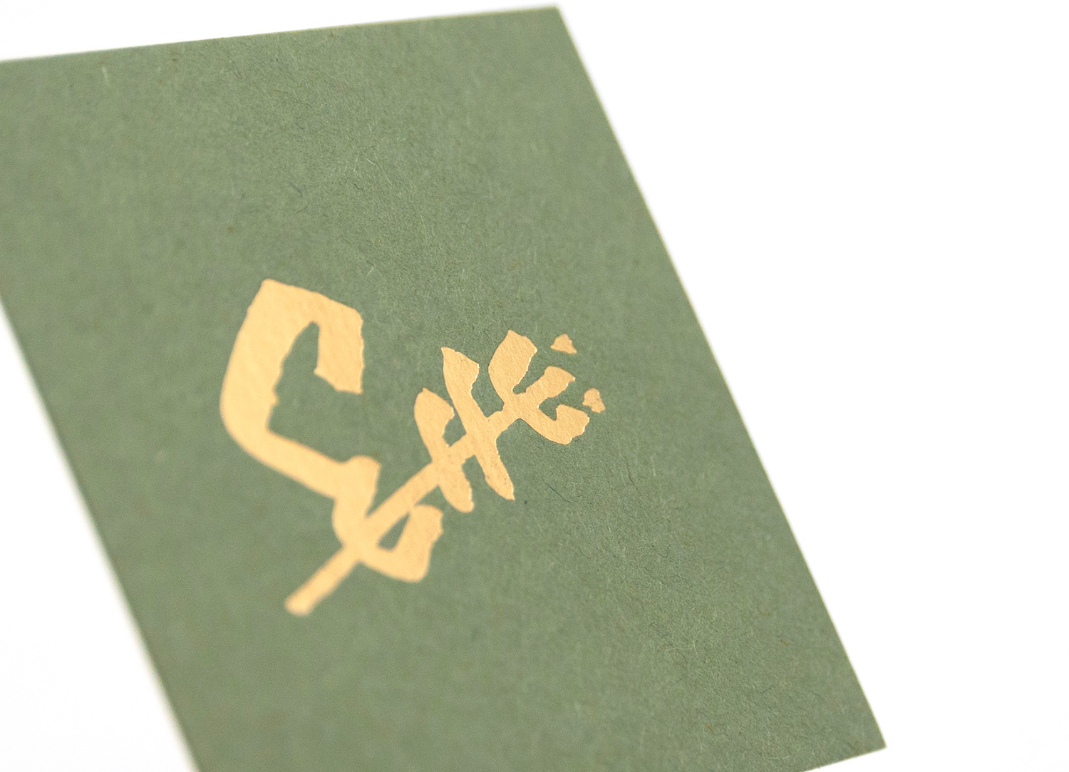 優しく落ち着いた印象のモスグリーンに金ツヤ消し箔と黒マット箔を添え、どちらの面も味わい深い雰囲気に仕上がりました。