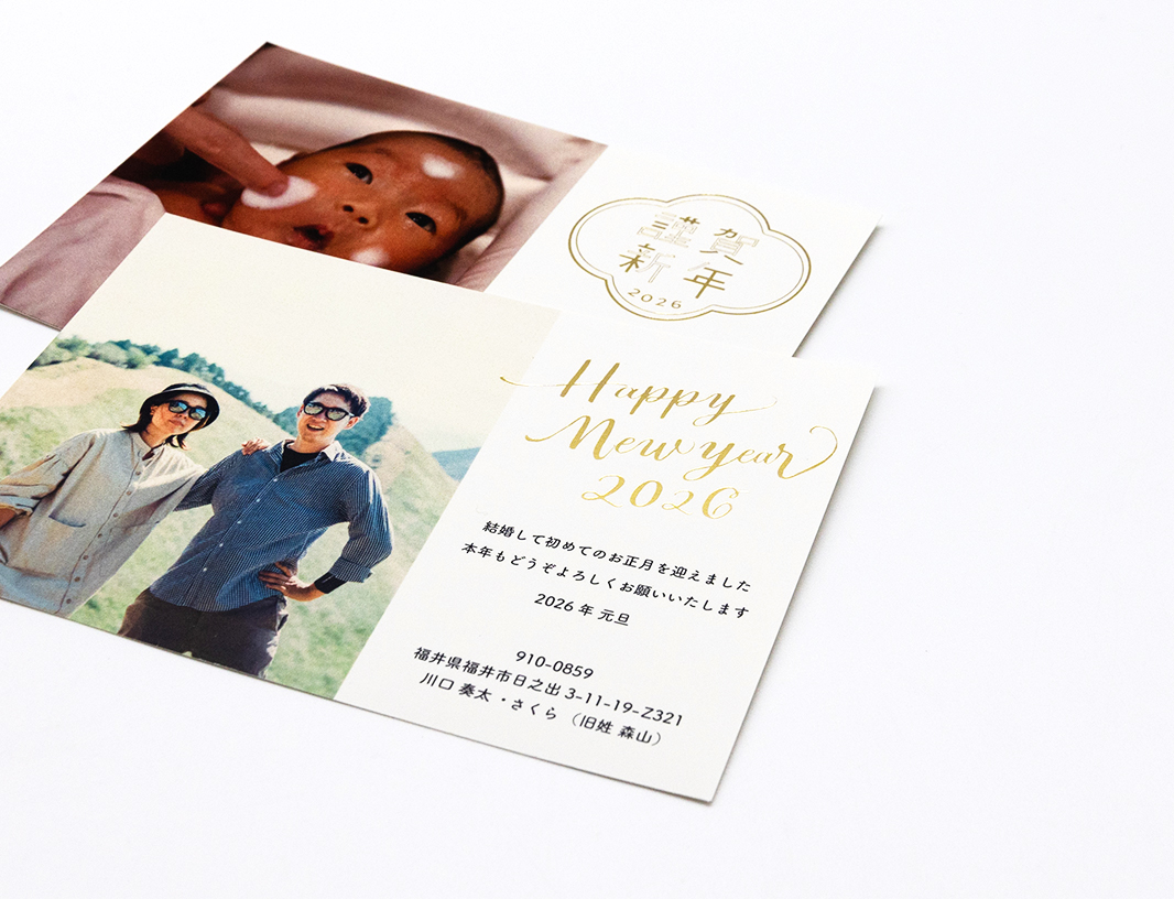 年賀状や特別な日に送るグリーティングカードに華やかな箔押しをそえて思い出に残る特別な1枚を。年末年始のイベント案内やクリスマスカードとしても最適です。