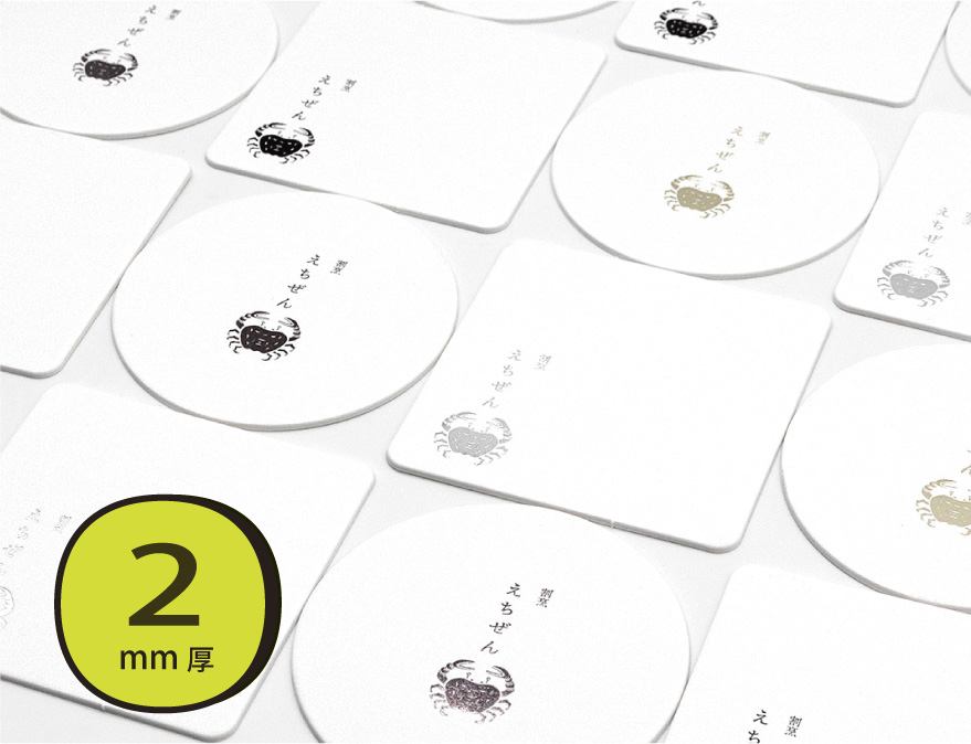 カフェやバー、レストランなど、飲食店に欠かせないコースター。箔押しのズガでは角型、丸型、菊型の3タイプをご用意しました。グラスの下で輝く箔押しコースターは雰囲気満点。ぜひお試しください。
